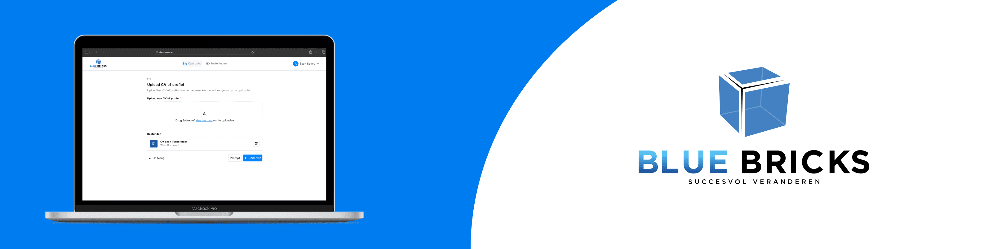 Blue Bricks is een innovatieve AI-tool die ik heb ontwikkeld om het proces van detachering efficiënter en eenvoudiger te maken. Detacheringsbedrijven zoals Blue Bricks kunnen met deze tool moeiteloos een opdracht van een klant invullen en een generiek cv van een medewerker uploaden. De AI analyseert vervolgens de opdracht en genereert automatisch een op maat gemaakt cv en motivatiebrief die perfect aansluiten bij de specifieke eisen en wensen van de klant.